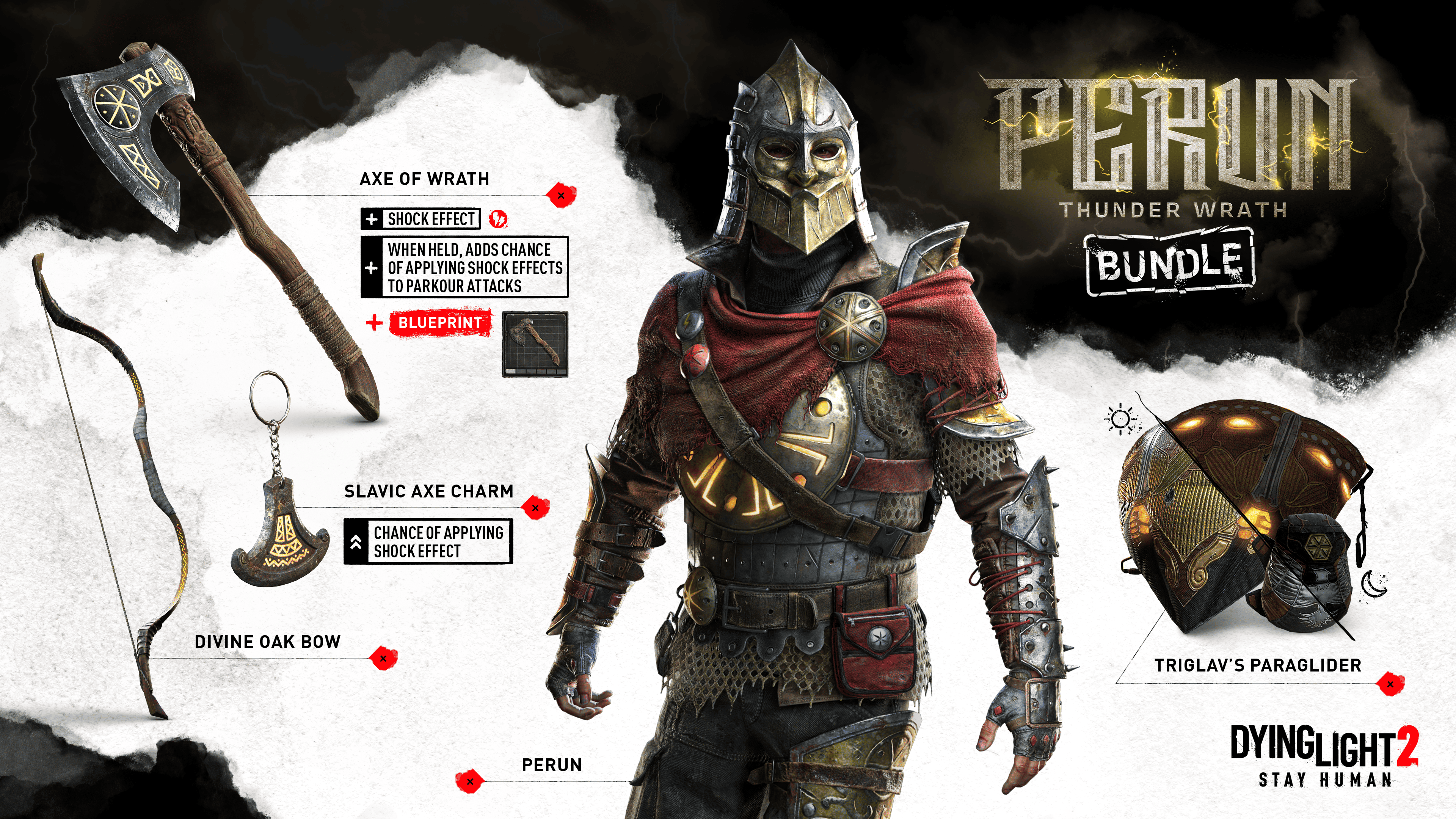 The Perun, Thunder Wrath Bundle includes melee and long-range weapons, a fantastical paraglider and a unique charm.