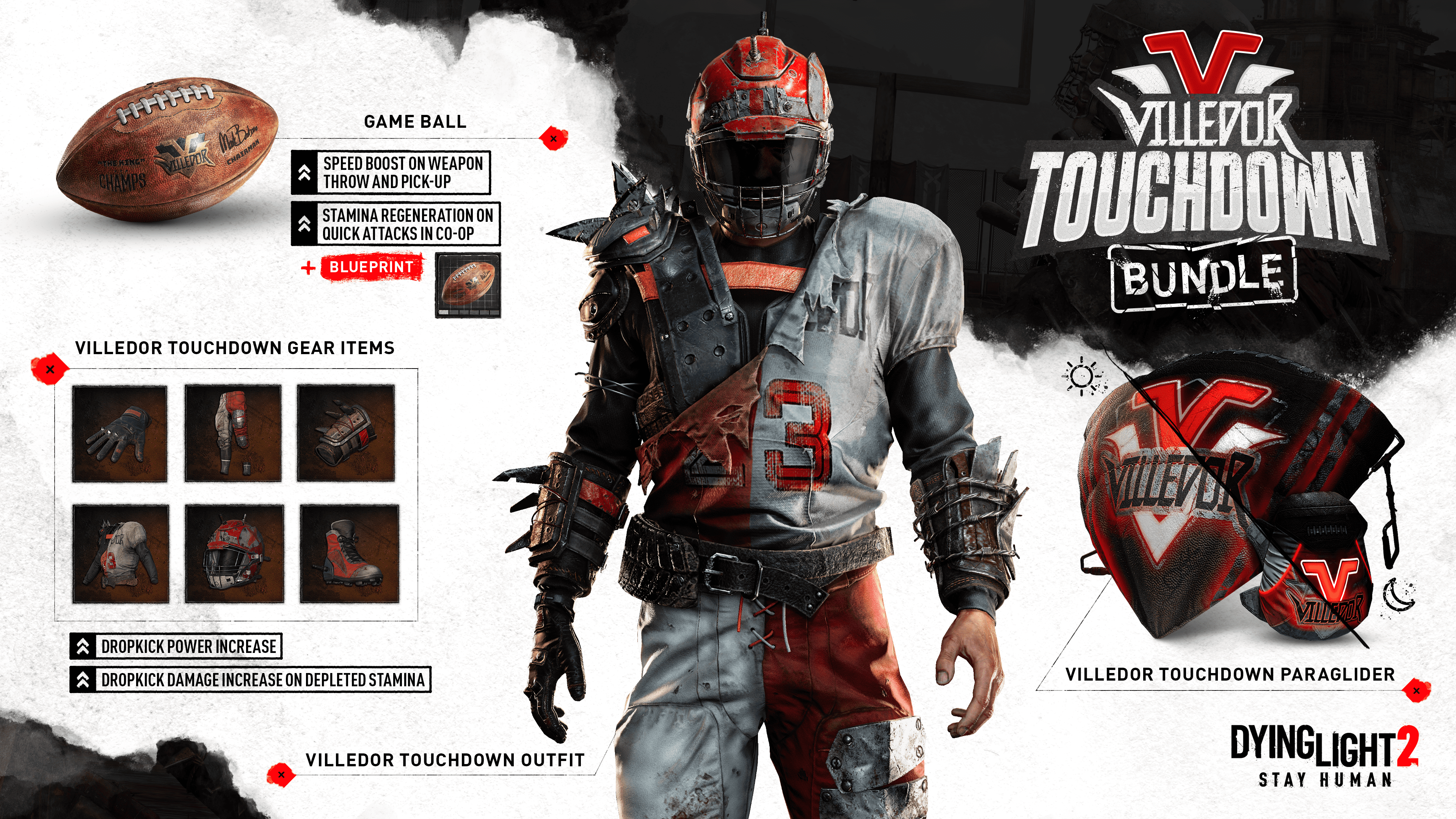 Villedor Touchdown Outfit — survival is a contact sport. Before you hit the field, it pays to be prepared. Show your love for your local team as you beat your enemies to a pulp. Every win counts!